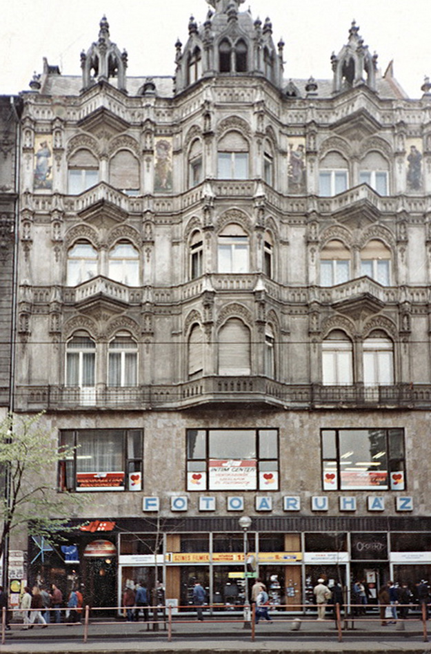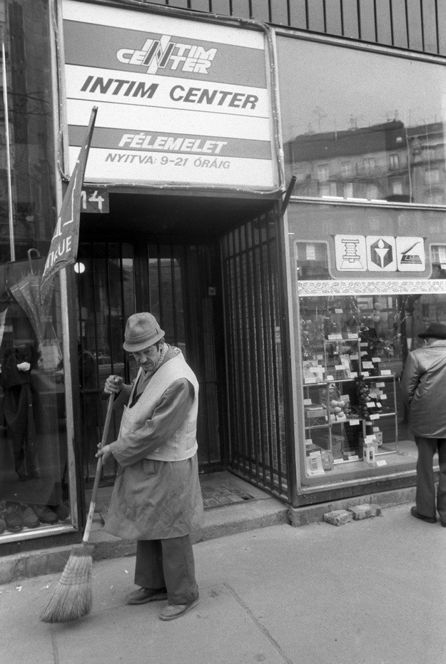 Az alábbi képen: Egy férfi söpri a járdát az 1989 november 15-én megnyílt Intim Center bejárata előtt a Tanács körút 14. számú ház előtt. Akkor Ofotért működött a szexbolt alatt.