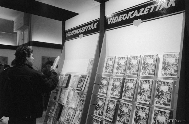 Az alábbi képen: Egy férfi válogat a videokazetták között a november 15-én megnyílt Intim Centerben a Tanács körúton. A VHS pornókazetták behozatala, egy évvel előtte még tiltott volt, a határokon az autókban is kutatta utánuk.
