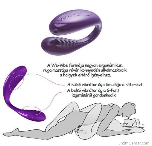 A We-Vibe alakja tökéletesen illeszkedik a női nemi szervhez, használata nagyon kényelmes, tervezésének minden szakaszában a hölgyek igényeit tartották szem előtt. Puha, orvosi szilikonból készült anatómiailag profin kialakított akkus izgató. Az extra hajlékony kényeztetőt aktus előtt kell úgy az intim részhez helyezni, hogy egyik vége a hüvelyben legyen, a másik pedig a csiklónál. Együttlét közben redőzött felülete és a kétmotoros technológia egyszerre stimulálja a két kéjpontot. Van aki maszturbáláshoz használva a hüvelybe és az ánuszba vezetve, kezével a csiklóját simogatva ér el kimagasló kéjérzést. A beépített, korszerű NiMH akkunak köszönhetően extra hosszan bírja, 9 rezgésmóddal. Vízálló.